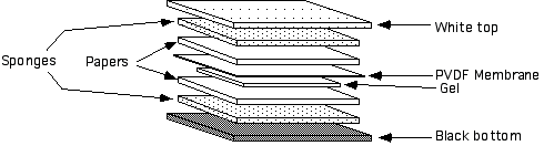Build transfer apparatus. Black side down. Sponge, Paper, Gel, Membrane, Paper, Sponge and close white side (sometimes red) down.